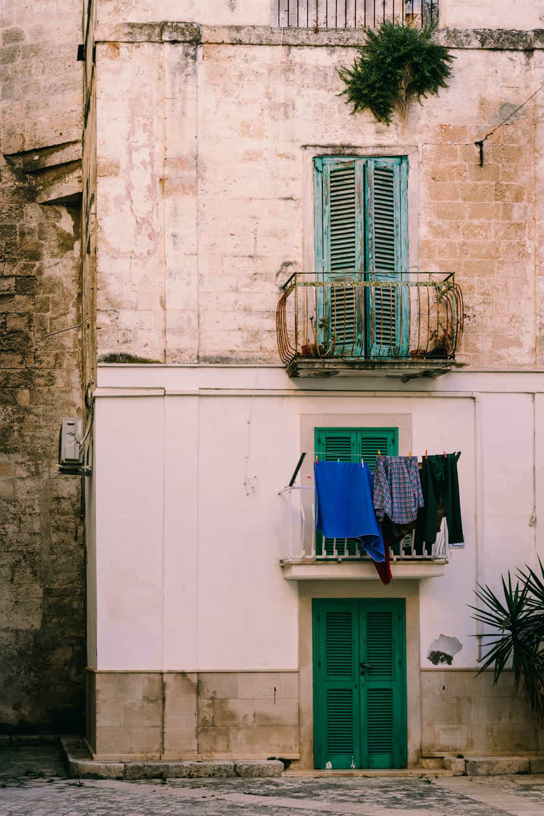 We watched thrill trump sanity as jumpers plunged into the water before heading to Monopoli. Equally close to the sea, Monopoli doesn’t look quite as daring though for a lack of steep cliffs. The two dominant colours, in many very subtle nuances, however, are just the same: Brightly coloured blue fishing boats bobbing in a small harbour beneath turquoise window shutters mirrored the palette of blues of the sea and the sun. Later in the day, the blinding whiteness of the stone and vibrant blues yielded to soft pastel tones, which changed the atmosphere entirely.
